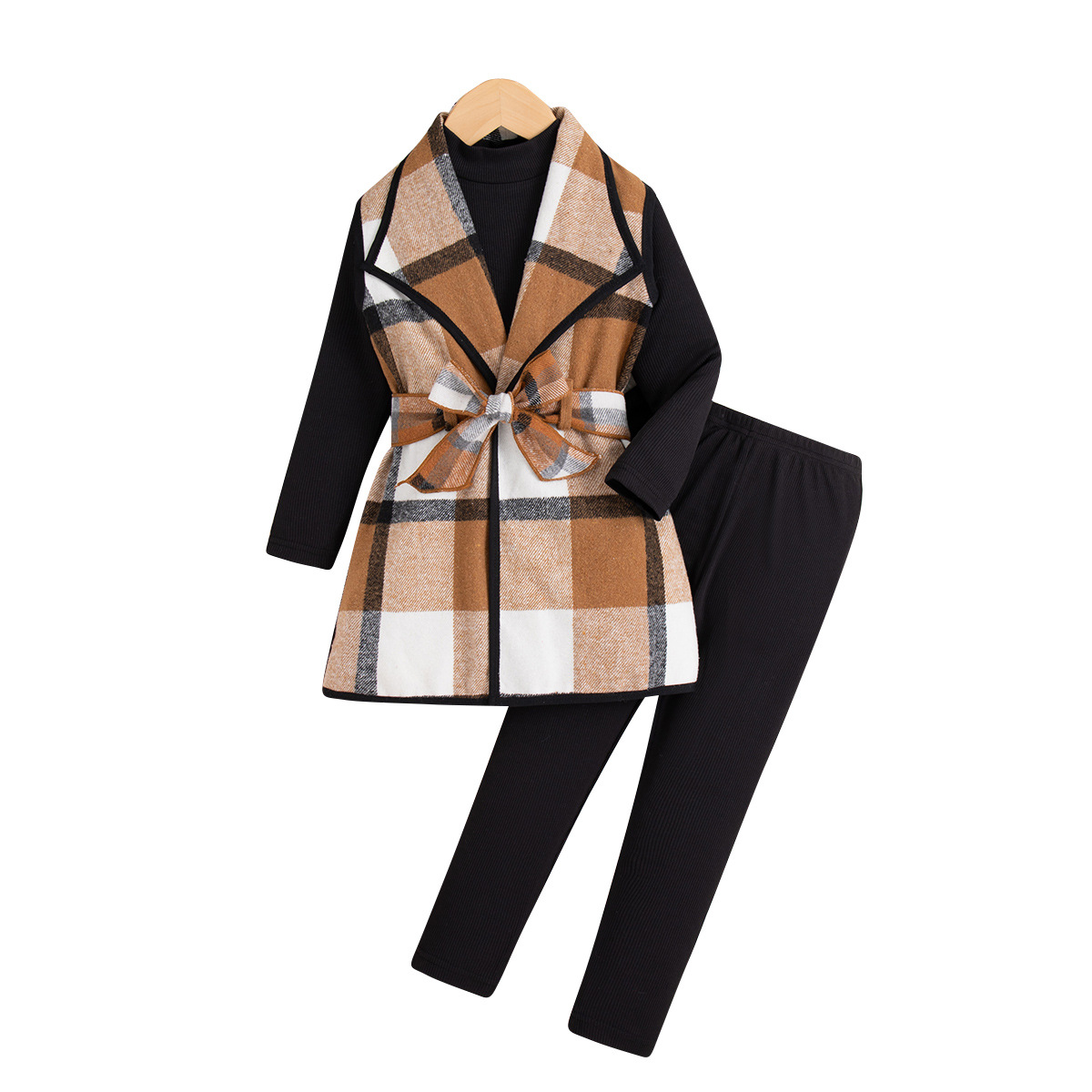 - Includes 3 pieces: Long-sleeve black top, leggings, and plaid belted vest