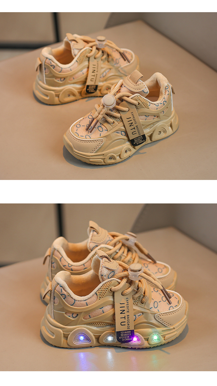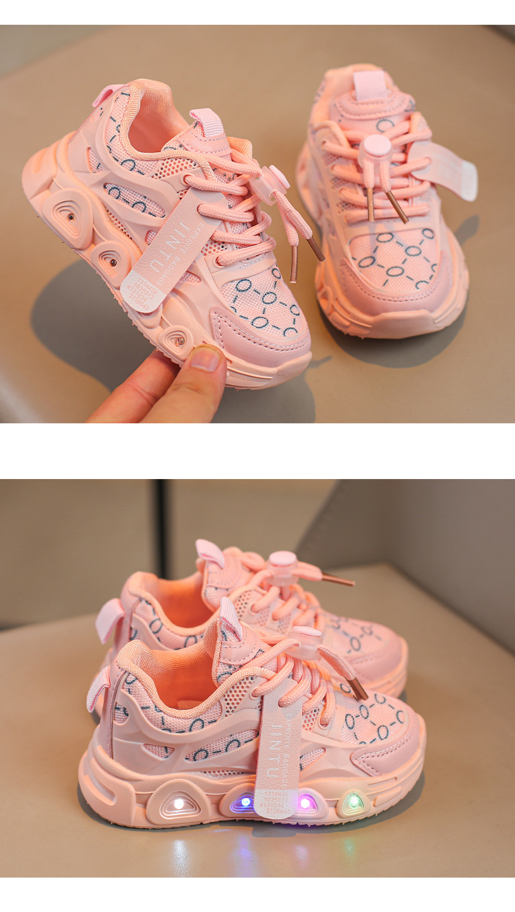 Light up every step with these vibrant and playful kids' sneakers! Available in three trendy colors – white, pink, and beige – these shoes are designed to keep little feet comfortable while adding a burst of fun with every step. Built with breathable mesh fabric and a durable rubber sole, these sneakers feature multicolored LED lights embedded in the sole that flash with movement. Perfect for school, playtime, or parties, they also come with easy lace-up closure and a cool printed design for extra flair.